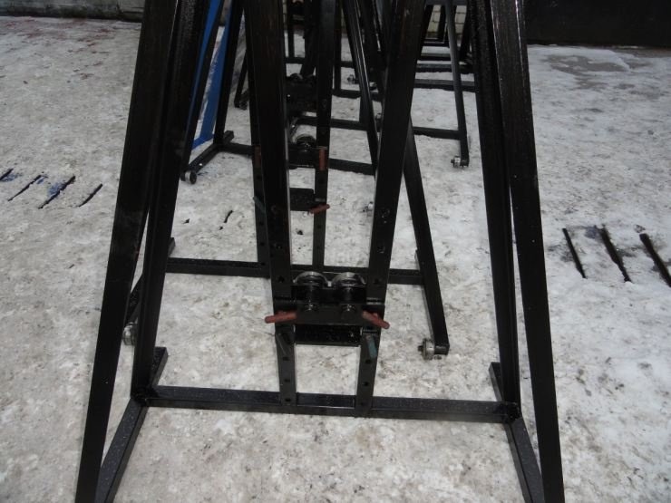 Ролики, используемые в бытовых стиральных машинах, устанавливаются спереди. В процессе сборки используется автомобильная отбойная чашка, а для стоек - стержень диаметром 20 мм.