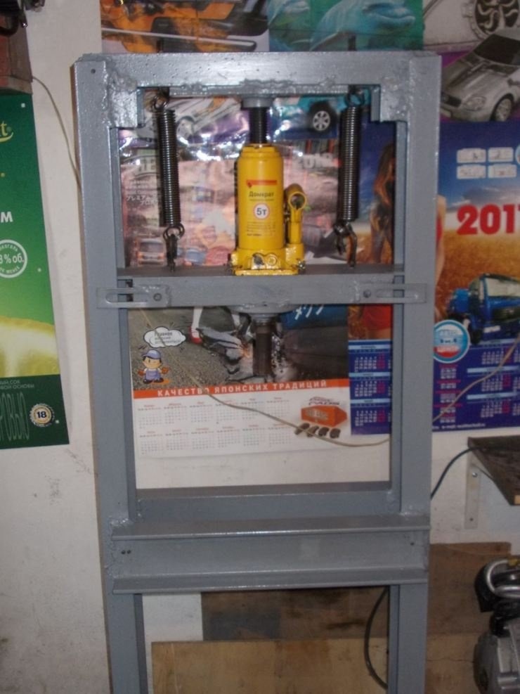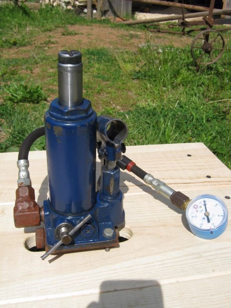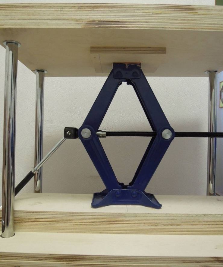 На основе бутылочного домкрата легко сделать домашний пресс. Такой подъемник привлекателен тем, что ручной насос уже встроен в конструкцию.